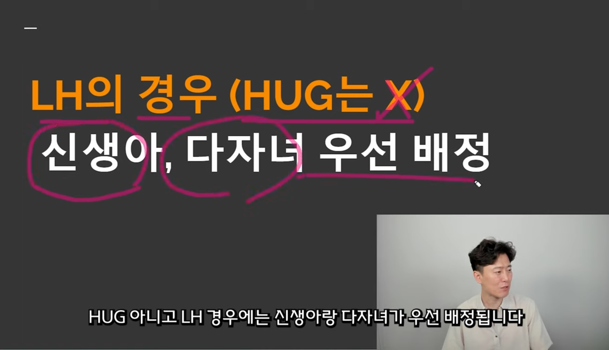 LH의 경우에는 신생아, 다자녀 우선 배정이고 남은 물량은 추첨입니다. HUG 는 우선 배정이 없고요.
